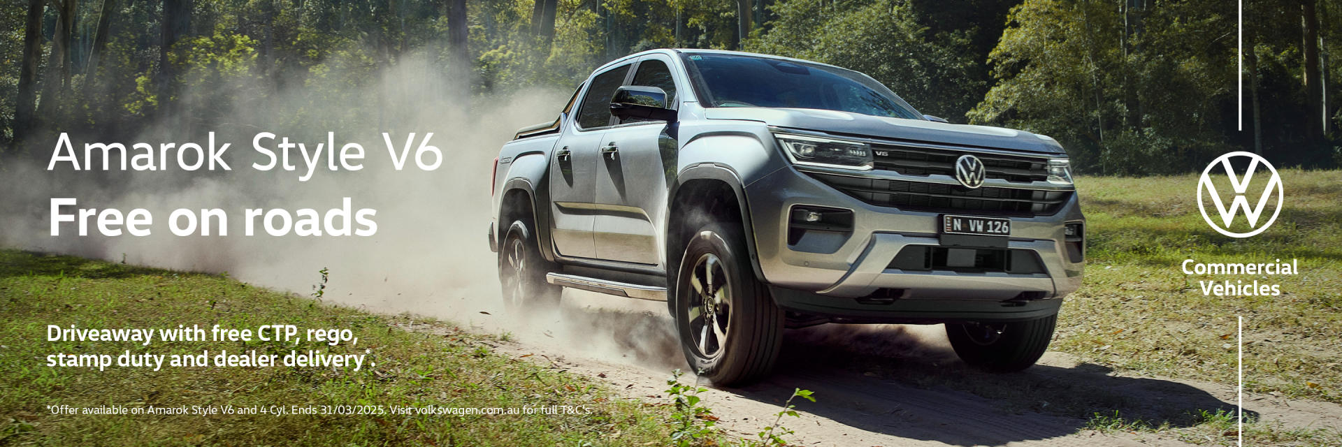 Free On-road Costs Offer is available on new and demo MY23 & MY 24 Amarok Style V6 & 4 Cyl vehicles purchased from 01/12/2024 and delivered by 30/04/2025. While stocks last. Private buyers only/Excludes Government, fleet and rental buyers. The offer includes standard on-road costs, such as registration, dealer delivery, CTP insurance and stamp duty. Free On-road Costs Offer will be awarded as a discount off the Manufacturer's Recommended Retail Price and is not transferrable or redeemable for cash. Available in conjunction with current finance comparison rate offer. Volkswagen Group Australia reserves the right to extend, withdraw, or change all offers.